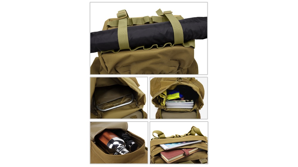 The main compartment of the tactical army rucksack holds essentials, while exterior pockets provide quick access to smaller items.